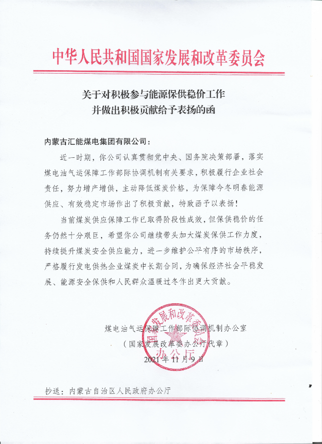 國家發(fā)改委關(guān)于對積極參與能源保供穩(wěn)價工作并做出積極貢獻給予表揚的函